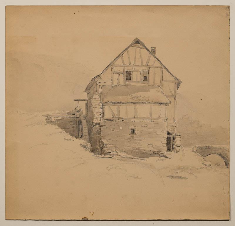 Fachwerkhaus mit Wasserrad; rechts im Mittelgrund eine kleine Steinbrücke.