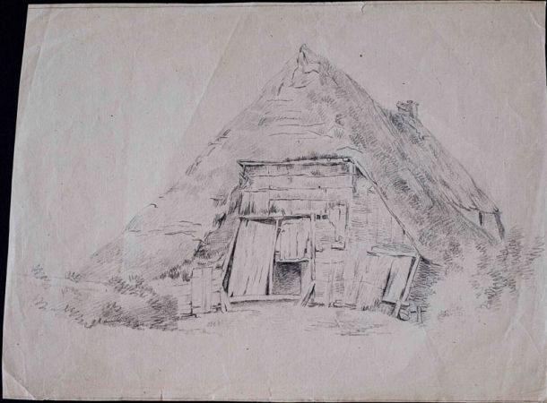 Verfallene Bauernhütte; Vorzeichnung zur Lithographie (vgl. 0772), aus der Serie "Landschapsstudien (Koekkoek/Daiwaille).