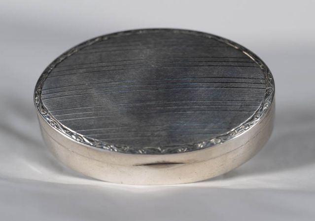 Ovale Pillendose mit Scharnierdeckel; Deckel graviert mit parallelen Linien und Rankenrand; Boden mit Rautenmuster; innen vergoldet.