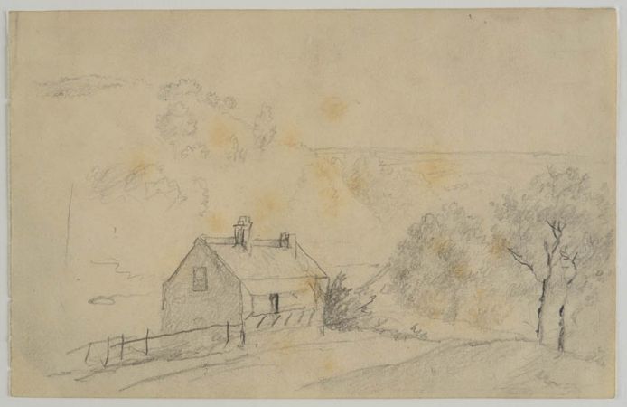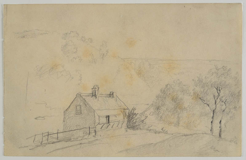 Skizzenbuchblatt: Blick in eine Hügellandschaft; im Vordergrund ein Haus und Bäume.