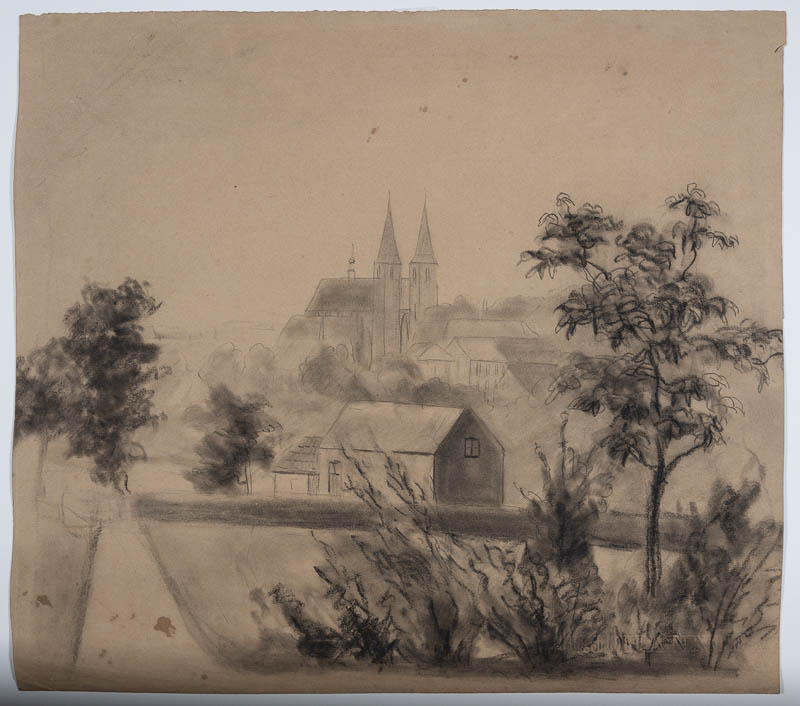 Ansicht aus dem Nordwesten; im Vordergrund Bäume, im Mittelgrund einige Häuser und in der Bildmitte im Hintergrund die Stiftskirche.
