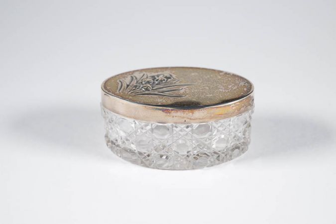 Kristalldöschen mit Silberdeckel aus einer Toilettengarnitur; oval, flacher Deckel mit Schwertlilien im Reliefdekor.