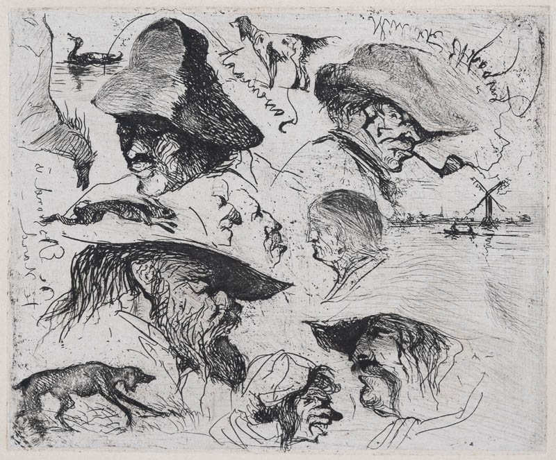 Verschiedene Skizzen: Kopfstudie, Wasserlandschaft mit Mühle am Horizont, verschiedene kleine Tierstudien.