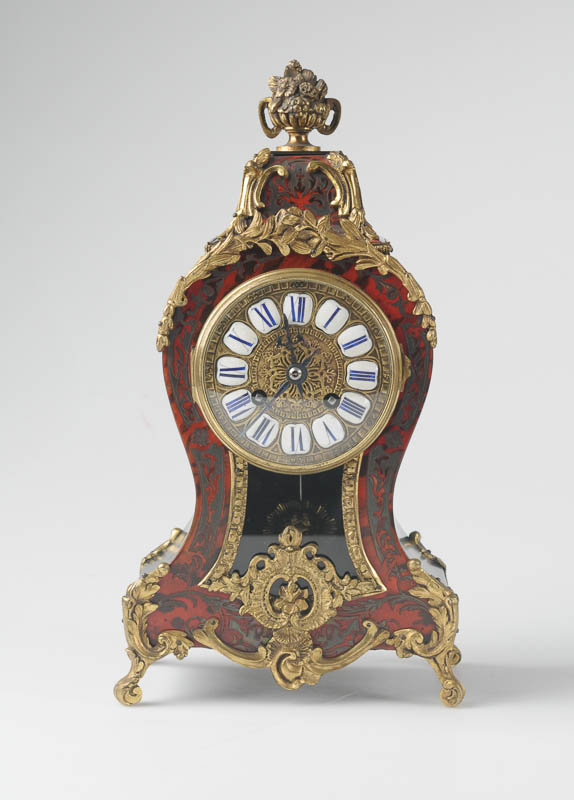Pendüle im historisierenden Neo-Rokoko Stil; emailliertes Zifferblatt mit römischen Zahlen; Pendel in Sonnen-Form hinter Glastür in der Front; rückseitig Tür zum Uhrwerk.