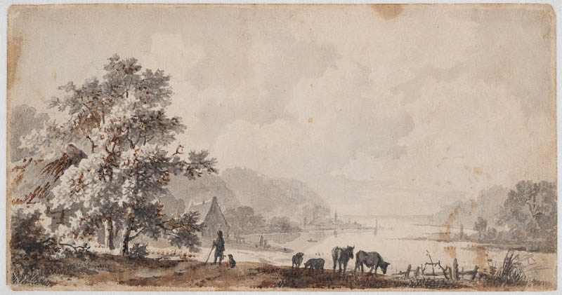 Flusslandschaft mit einem Hirten und Kuhherde; der Fluss erstreckt sich auf der rechten Bildhälfte.