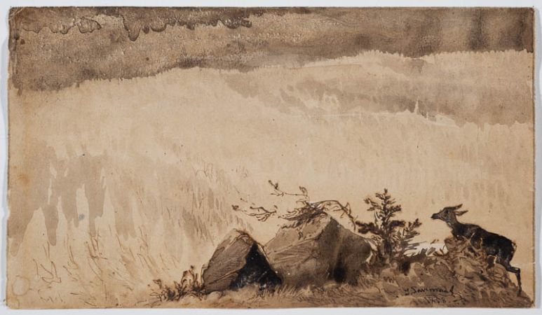 Böhmische Gebirgslandschaft mit Reh vor Felsbrocken im Vordergrund (aus Skizzenbuch oder Brief).