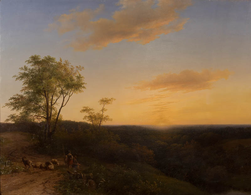 Bewaldete Landschaft mit den Türmen von Schloss Moyland (vor dem Umbau) im Mittelgrund vor Sonnenuntergang. Wahrscheinlich aus der ehemaligen Sammlung Steengracht.