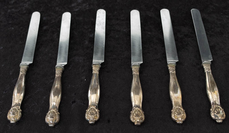 6 Dessertmesser mit silbernen Griffen; deutsch oder niederländisch.