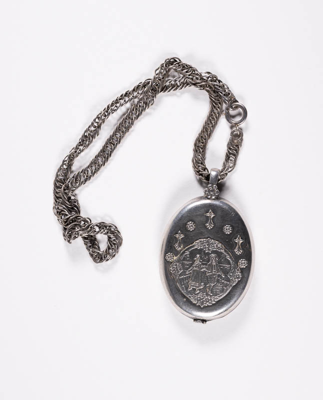 Medaillon Anhänger mit Kette; aufrechtes ovales Medaillon mit Öse; innen eine Seite mit Spiegel, die andere Seite ist vertieft und mit grünem Samt gefüttert; auf der Vorderseite Reliefdekoration: Blumenkranz worin tanzendes Bauernpaar; oberhalb sieben Ornamente (abwechselnd Blum- und Kreuzform).