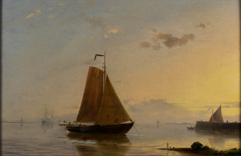 Abendstimmung; vor der Hafeneinfahrt liegt ein Fischerboot mit gehissten Segeln vor Anker; auf der See sind am Horizont weitere Boote sichtbar; das Ganze wird überstrahlt durch das Licht der untergehenden Sonne; bez. auf dem Boot.