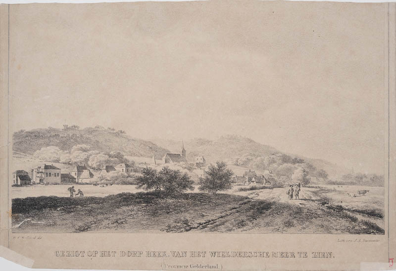 Ansicht des Dorfes Beek vom Wylermeer aus; aus der Reihe Vues pittoresques du Royaume des Pays Bas, Dawaille et Valhuijzen `Amsterdam, 1830/1831. Betitelt: Gezigt op het dorp Beek, van het Wieldersche Meer te zien