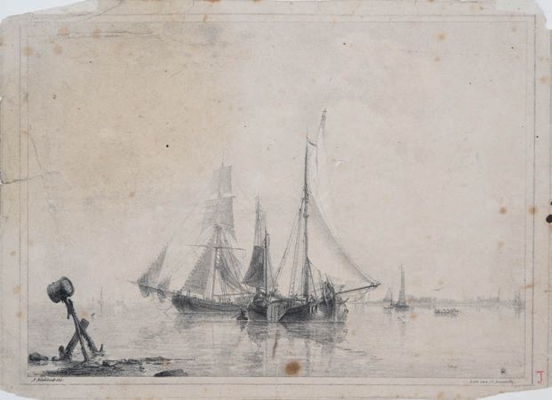 Fischerboote im Meer, im Hintergrund rechts eine Stadt; von B.C. Koekkoek später in Bleistift umrahmt.