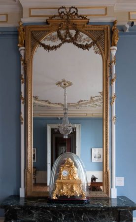 Spiegel in vergoldetem Rahmen mit oben, an den Seiten, zwei Frauenfiguren stehend auf einer Säule; Oberseite des Spiegels halbrund mit Dekorationen in Form von Girlanden; Spiegel aus dem Salon B.C. Koekkoek,1848.