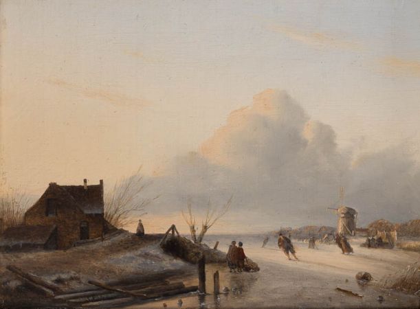Winterlandschaft mit Bauernhof, Schlittschuhläufer und Windmühle.