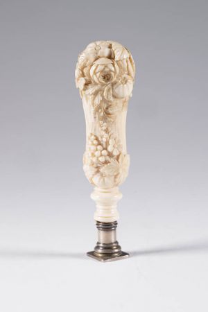 Großer Griff aus Elfenbein, dekoriert mit Blüten und Blättern im Relief; kleiner silberner Stempel: Quadrat mit Monogramm VJ oder JV.