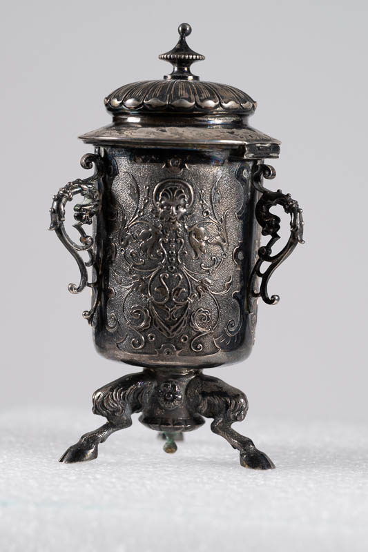 Zwei Senfbüchsen mit Renaissance Reliefornamenten und drei Ohren, stehend auf drei Bocksfüßen; hoher Deckel mit einem Loch im Rand für Löffel; gläserne Innentöpfe fehlen, die kupfernen Schrauben zur Befestigung sind stark oxidiert.