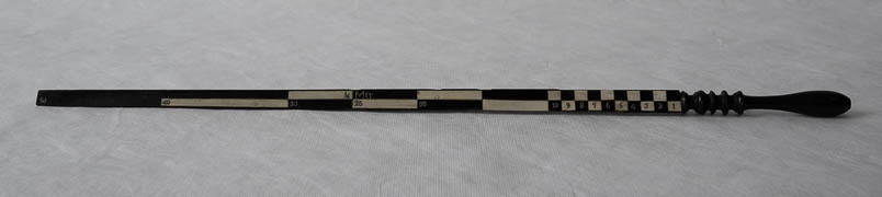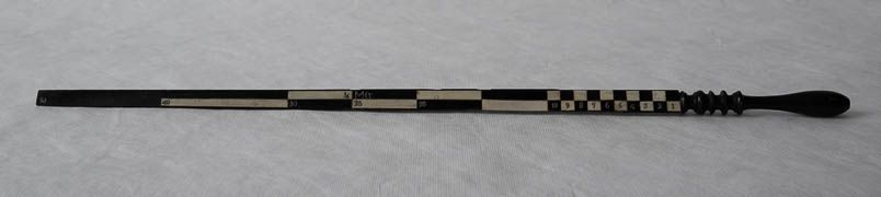 Stockmaß für 50 cm; dreieckiger Stock mit gedrechseltem Handgriff; Maßeinteilung im schwarzen Holz und Elfenbein, Dekor floral, im Schildpatt 12 Seiten.