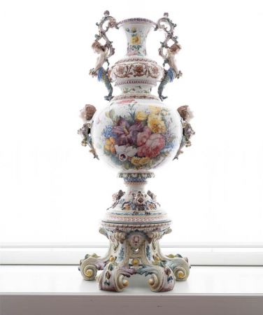Hohe Prunkvase aus zwei Teilen, Fuß und Vase, Deckel fehlt; vielfarbig bemalt; als Ohren zwei geflügelte Putten mit Fischschwänzen, an Vase zwei Frauenbüsten, am Fuß drei Köpfe von Ungeheuern.