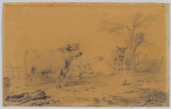 Polderlandschaft mit Stier, Kühen und einem Esel; vor einer Gruppe Kopfweiden stehen ein großer Stier, Kühe und ein Esel.