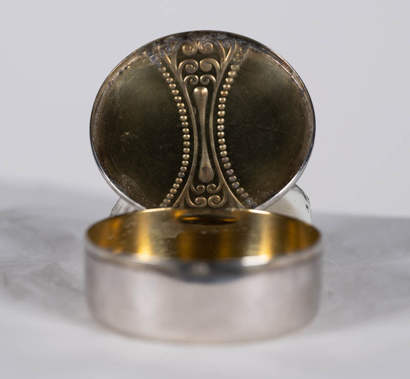 Runde Pillendose mit Scharnierdeckel; flacher Deckel, etwas gewölbt, mit in der Mitte X-förmiges Art-Deko Ornament; Innenseite vergoldet.
