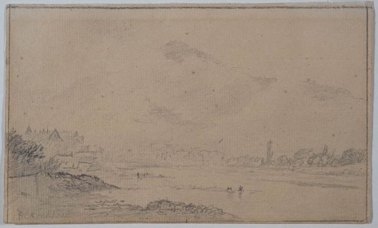 Skizze einer Flusslandschaft; im Vordergrund das linke Ufer mit Häusern links; im Mittelgrund das gegenüberliegende Ufer mit Häusern; im Hintergrund ein Gebirgszug.