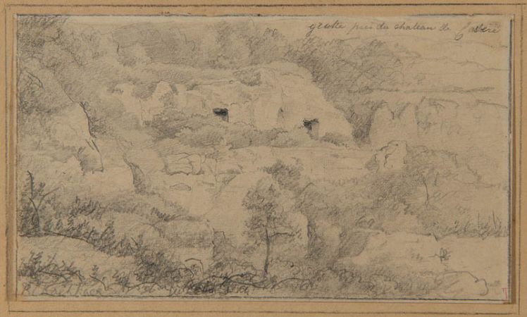 Blick auf die Landschaft mit der Grotte bei Schloß Castère in den Ardennen. Bezeichnet: Grotte près du château de Castère