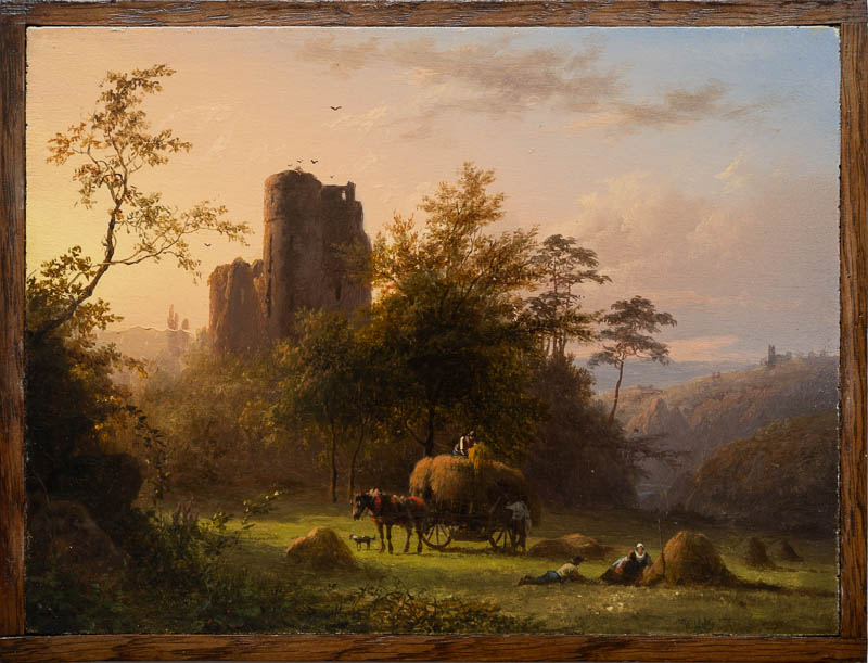 Heuernte; im Vordergrund eine Wiese mit beladenem Heuwagen und ein davor gespanntes Pferd und rechts vorne ruhendes Bauernvolk; im Mittelgrund links eine Burgruine, rechts im Hintergrund eine hügelige Flusslandschaft, Abendhimmel.