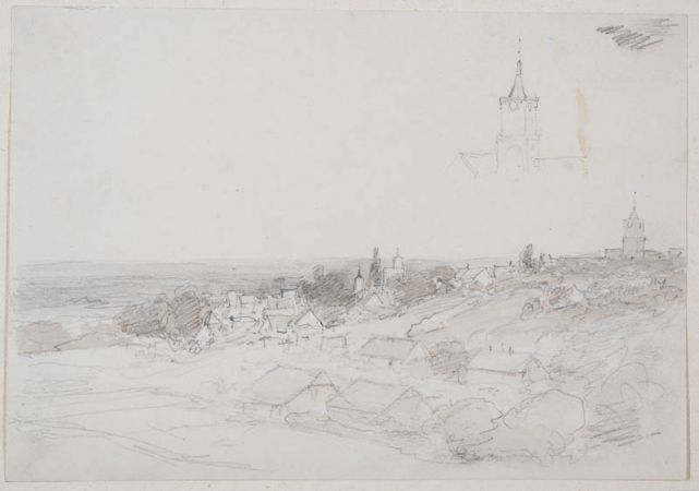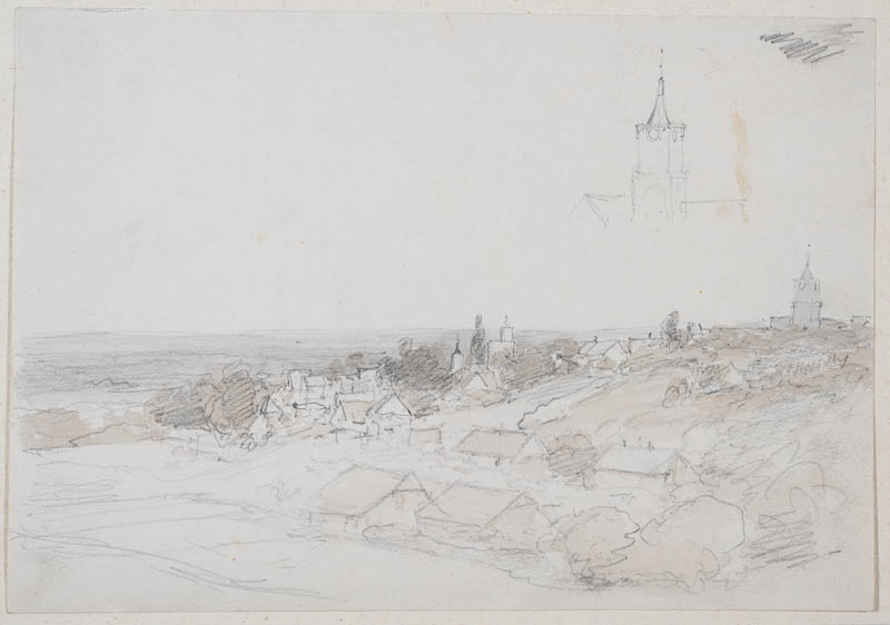 Landschaftspanorama mit der Silhouette der Stadt Kleve; eine zusätzliche Studie vom Turm der Schwanenburg, ist oberhalb des Panoramas nochmals skizziert; neben der Schwanenburg ist weiter deutlich zu erkennen der Atelierturm von B.C. Koekkoek, mittig des Bildes.