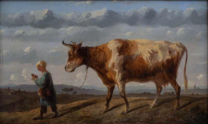 Lesender Schuljunge führt eine Kuh vor einer Landschaft; rechts im Hintergrund ein Dorf mit einer Windmühle.