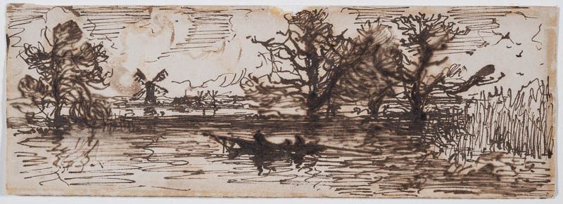 Flusslandschaft mit Boot im Vordergrund; im Hintergrund Mühle (aus einem Skizzenbuch).