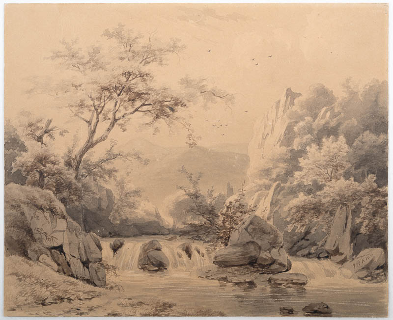 Fluß im Mittelgebirge; in der Mitte ein Fluß in felsigem Bett der aus dem Gebirge kommt; rechts eine hohe Felsformation, links Felsen, die mit Bäumen und Sträuchern bewachsen sind.