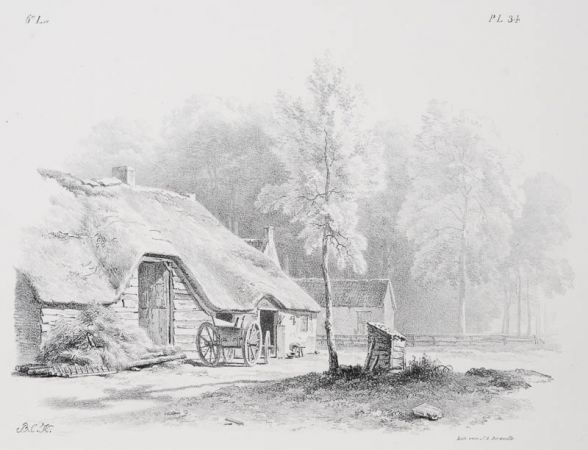 Landschaftsstudien / landschapstudies; Reetgedeckte Katstelle mit Karre; 34. Blatt von 59 Lithographien.