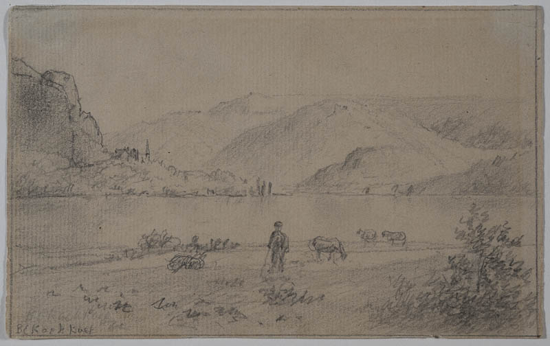 Am Rhein; vorn Bauer mit Kühen, links am jenseitigen Ufer unter schroffen Felsen ein Ort mit Kirche.