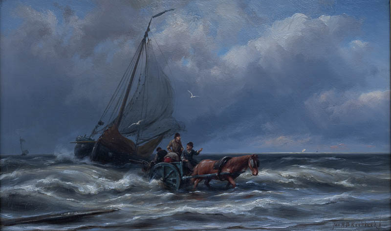Seestück mit Fischerboot und Pferdewagen