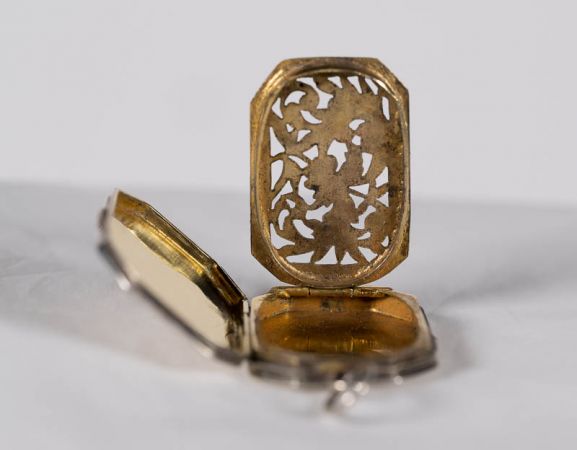 Rechteckige Dose mit abgeschrägten Ecken; Deckel und Boden dekoriert mit gravierten Linien; Innenseite dekoriert; klappbarer Innendeckel mit ausgesägtem Rankendekor.
