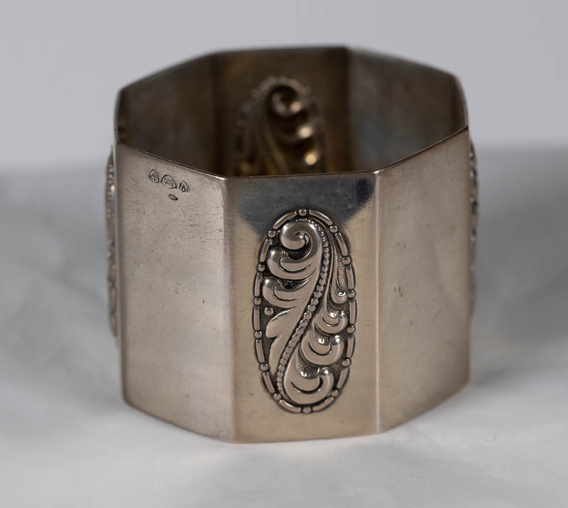 Achteckiger Ring mit abwechselnd glatter und bearbeiteter Oberfläche mit einem stilistischen Blatt in einem Oval.