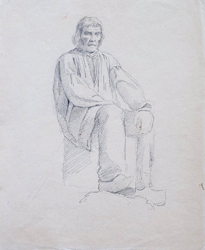 Figurenstudie eines sitzenden alten Mannes in Arbeitskittel und Klompen; auf einer Kiste sitzend, Arme auf die Beine gestützt, in leichter Seitenansicht gesehen.