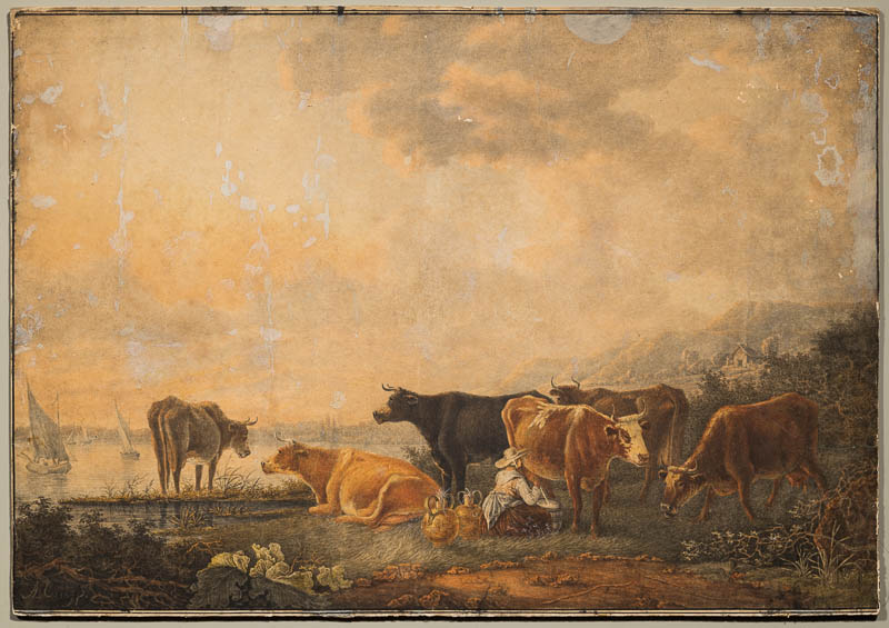 Kopie nach Aelbert Cuyp (Dordrecht 1620 - 1691), Kühe am Ufer eines Flusses mit melkender Frau. Rechts Hügellandschaft mit Holzhütte.