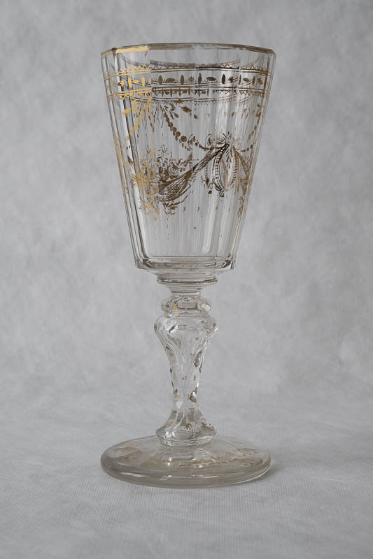 Gläserner Pokal mit Golddekor mit Fruchtkörben und Girlanden; zwölfseitiger Becher, sechsseitiger Stamm, runder Fuß mit zwölf eingeschliffenen Flächen.