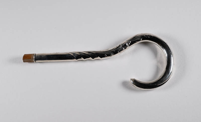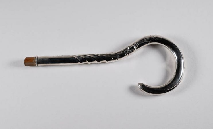 Hirtenstabförmiger Griff; Stamm spiralförmig gedreht, am Übergang zur Krumme sind Ranken mit Lilien und Knöpfen.