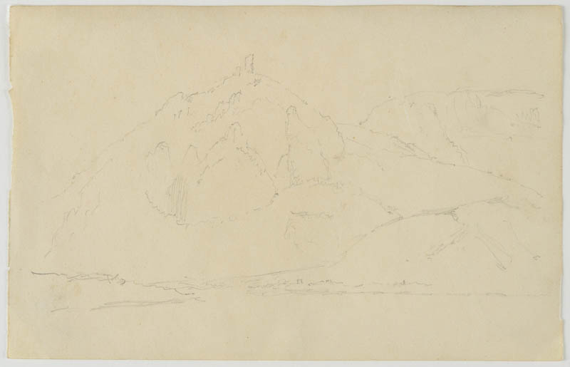Skizzenbuchblatt: Blick auf eine Gebirgslandschaft mit Turmruine.