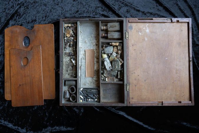 Malkasten von Louise Hermina Carry Koekkoek, eingeteilt in ein langes Fach und fünf kleinere Fächer mit Blech bekleidet; Inhalt: Farben - 2 Flaschen Firniss, blecherne Behälter für das Palet, 2 Holzpaletten, Dose Holzkohle und Kreide .