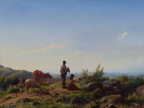 Panoramalandschaft; im Vordergrund zwei Hirtenkinder, ein Junge auf Stock gestützt, ein Mädchen knieend, den Rücken zum Betrachter einer weiten Panoramalandschaft zugewandt; im Hintergrund eine Bergkette; links im Vordergrund Kühe und Schafe; rechts Felsbrocken.