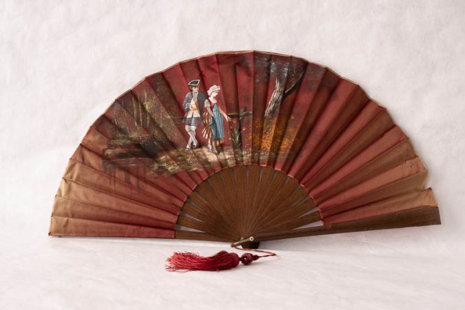 Fächer aus roter Seide und Holz, bemalt in Farben: eleganter junger Herr und Bauernmädchen; 16 hölzerne Beine, das erste und letzte rustikal geschnitzt wie Äste.