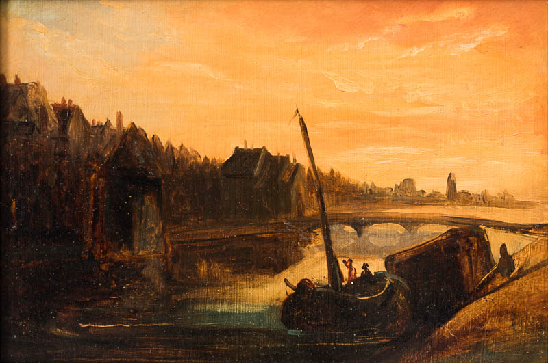 Kanal mit Brücke am Stadtrand,. Im Vordergrund rechts ein Segelschiff. Abendlicht.