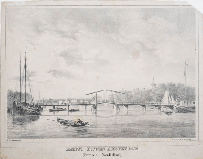 Im Hintergrund die "Hoogesluis" Brücke zu Amsterdam; rechts ist der Anfang der Prinsengracht zu sehen; aus der Reihe vues pittoresques du royaume des Pays-Bas. Betitelt: Gezigt binnen Amsterdam (Povincie Noordholland)