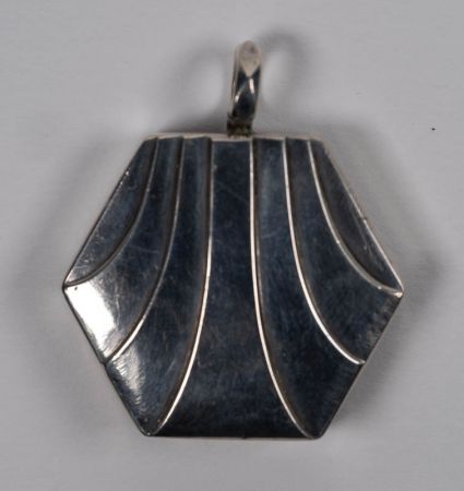 Sechseckige Kinderrassel, muschelförmig dekoriert; oben eckiges Äuglein; unten sind zwei Löcher.