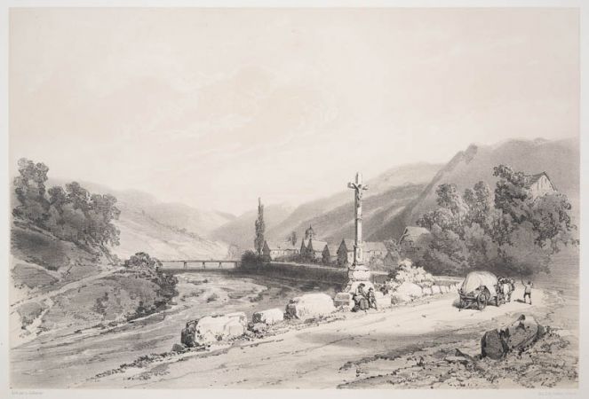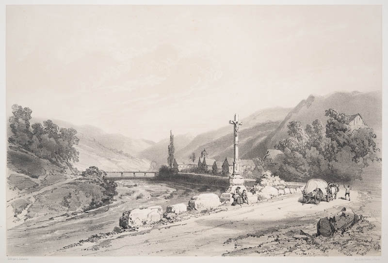 Baden-Baden und seine Umgebung, Landweg nach Forbach mit Bildstock und Reisende; dahinter eine Stadt und eine Brücke über einen Fluss; Bild aus 'Baron de Montemart, voyage pittoresque dans le Grand-Dusché, 1836'. Bezeichnet: Baden & ses Environs, Route de Forbach