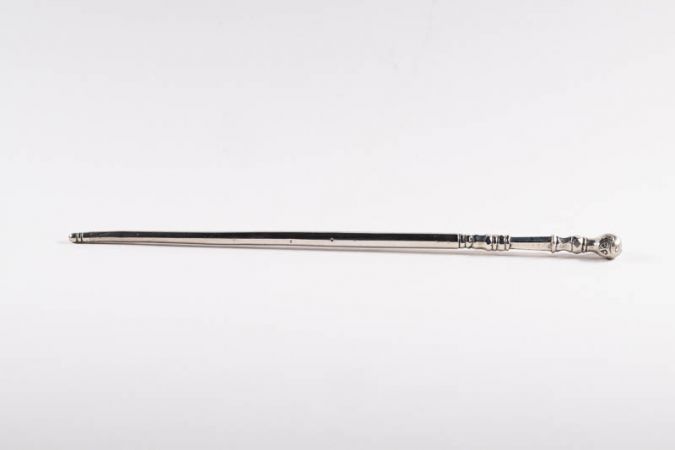 Lange dünne Nadel, nach unten stumpf-spitz zulaufend; oberes Drittel ornamental dekoriert: Profilbänder und sechseckiges Teil; der obere Knopf ist als Karikatur Kopf (Affe?) gestaltet.