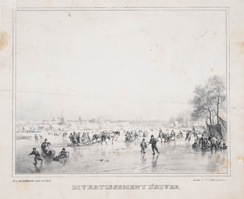 Divertissement d'Hiver; Wintervergnügen; Pferdeschlitten und Schlittschuhläufer vor einer Stadt; aus: Album lithographique de1830 par B.C. Koekkoek a Amsterdam chez J.A. Daiwaille.
